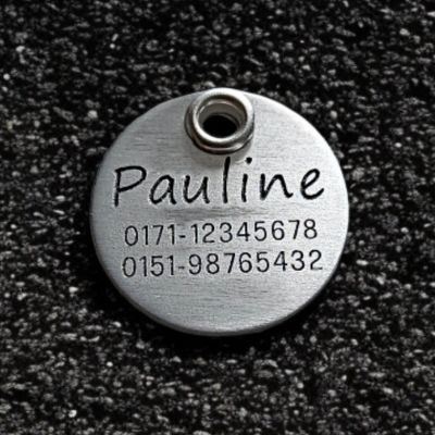 Ausstattung: Lochverstärkungsöse (Farbe: Silber) + Schlüsselring 20 mm, Stahl vernickelt (silbern glänzend). Gegen einen Aufpreis von 0,50 € ist auch ein Schlüsselring aus Edelstahl oder aus vermessingtem Stahl erhältlich.