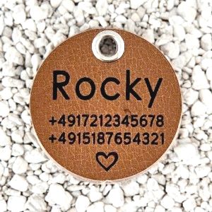 Ausstattung: Lochverstärkungsöse (Farbe: Silber) + Schlüsselring, je nach Größe der Marke 16, 18 oder 20 mm Stahl vernickelt (silbern glänzend). Gegen einen Aufpreis von 0,50 € ist auch ein Schlüsselring aus Edelstahl oder aus vermessingtem Stahl erhältlich.