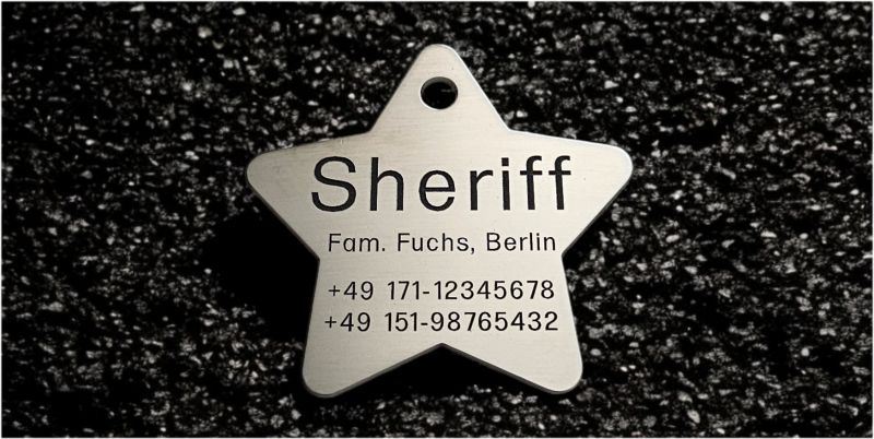 Sonstiges: Hundemarken aus Edelstahl sind sehr robust. Einzige Schwachstelle: der Steg über der Bohrung für den Schlüsselring kann mit der Zeit durchgescheuert werden. Bitte gelegentlich prüfen, ob noch alles in Ordnung ist.