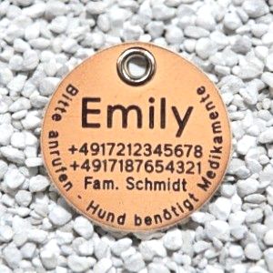 Ausstattung: Lochverstärkungsöse (Farbe: Silber) + Schlüsselring, je nach Größe der Marke 16, 18 oder 20 mm Stahl vernickelt (silbern glänzend). Gegen einen Aufpreis von 0,50 € ist auch ein Schlüsselring aus Edelstahl oder aus vermessingtem Stahl erhältlich.